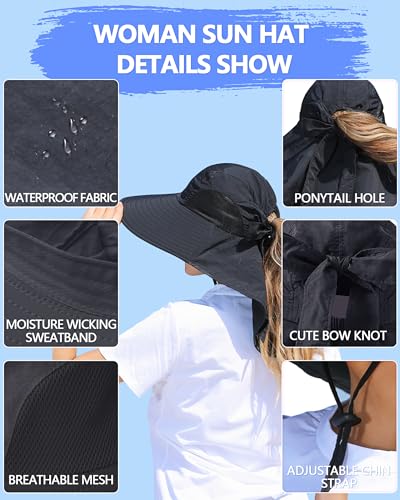 SENWAI Womens Sun Hat Outdoor UV Protection Wide Brim Fishing Hat with Ponytail Hole Neck Flap for Beach Hiking Camping, Black