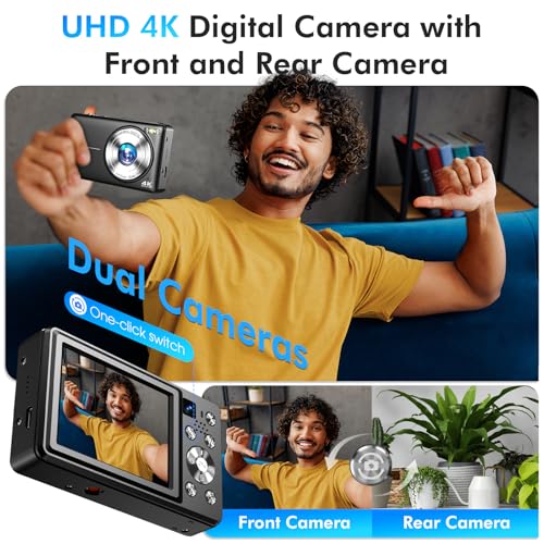 4K Digital Camera, 64MP Autofocus Vlogging Camera with Dual Lens, 16X Digital Zoom YouTube Compact Travel Point Shoot Camera for Teens Beginner, Anti-Shake,2 Batteries, 32GB Card (Black)