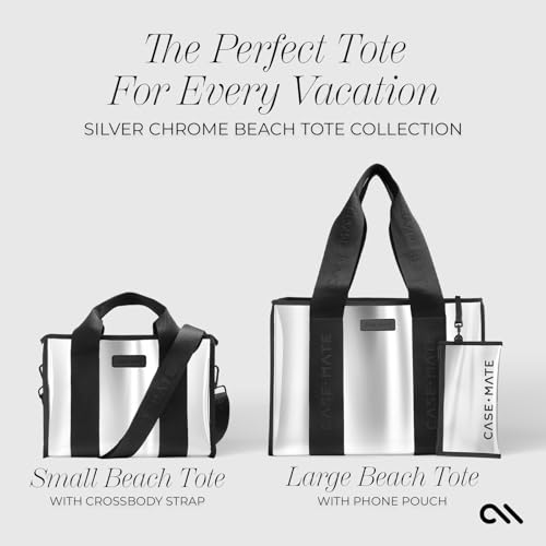 Case-Mate Silver Chrome Small Beach Tote – Lightweight Beach Bag with Crossbody Strap for Women – Waterproof, Tip-Proof, Foldable & Washable – Tote Bag for Pool, Travel and Vacation