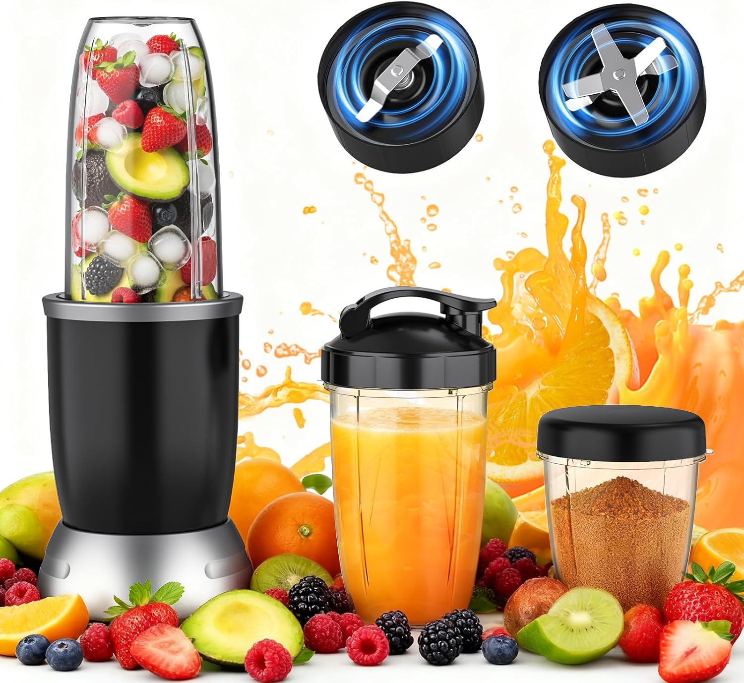 ã€2-in-1 Blender and Grinder Combo】: Switch between the 6-blade assembly for blending and the 2-blade attachment for grinding. With 3 included cups, you can prepare smoothies, sauces, nut butters, dips, fresh juices, and baby food, while also grinding nuts, spices, coffee, and grains—all in one convenient system. Multi-Size Cups for Home & On-the-Go