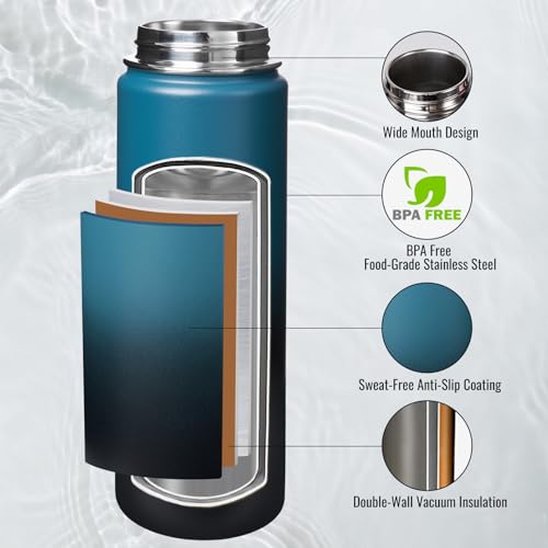 Premium Materials: Our food-grade 304 stainless steel water bottle ensures safe and healthy hydration throughout the day. With a sweat-proof, non-slip coating and being BPA-free, our insulated water bottle is a reliable companion for all activities.