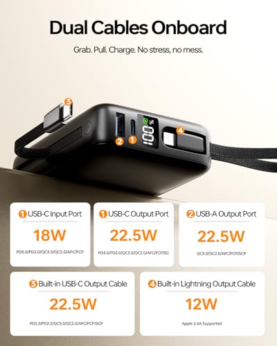 [Compact & Portable] : Measuring just 4 × 2.8 × 1.1 inches and weighing only 0.74 lbs, this power bank fits easily in your pocket, purse, or luggage. Its unique built-in cable snaps in place to double as a handy carrying strap, so you can hang it from your wrist, backpack, or suitcase. Perfect for trips, daily commutes, or outdoor adventures, it keeps your devices charged, your bag clutter-free, and your power bank always within reach.