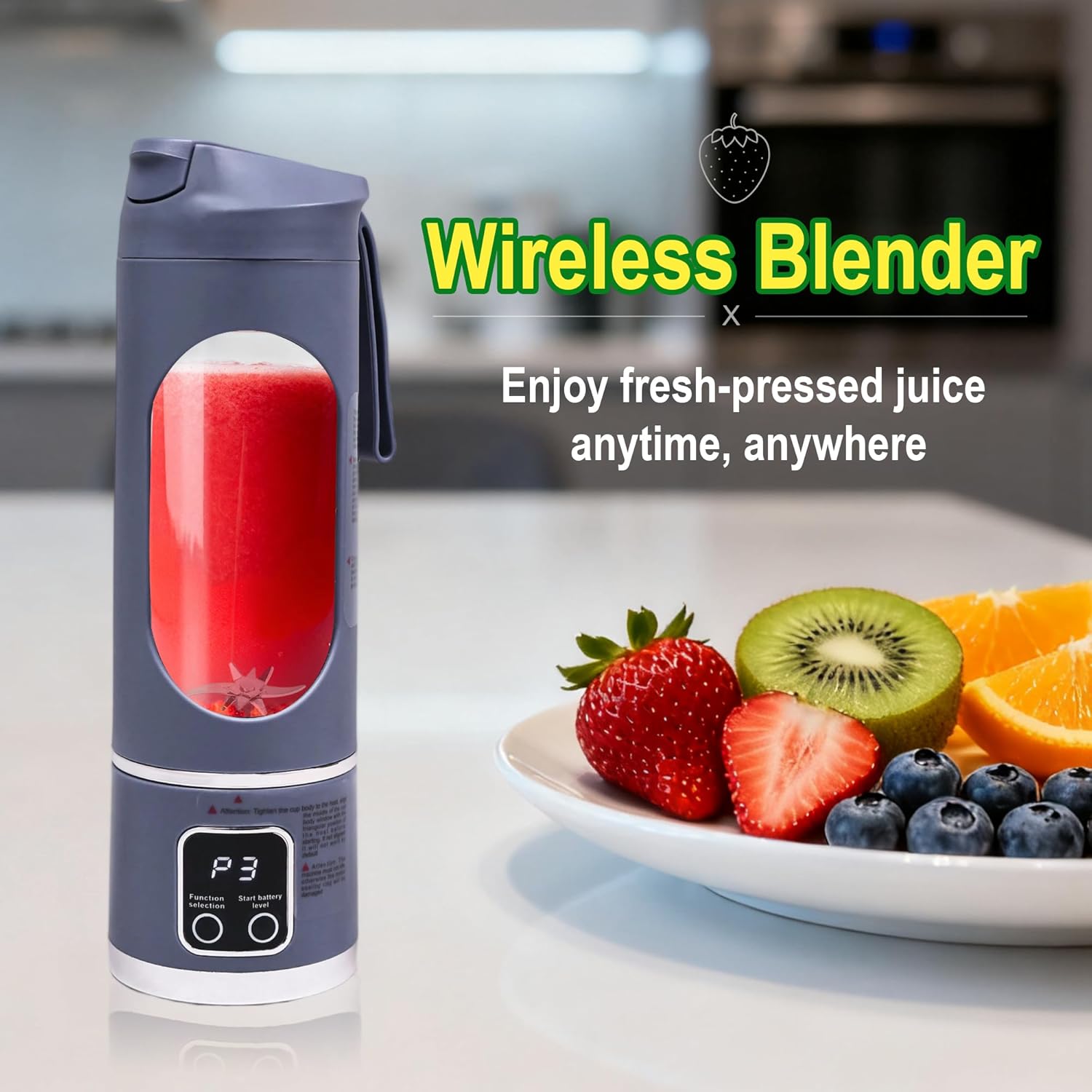 PORTABLE DESIGN: Compact personal blender with convenient carrying strap, featuring a sleek gray exterior and digital LED display for easy operation